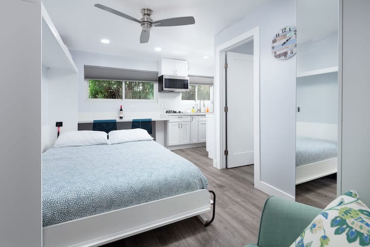 This quaint studio is the perfect launching point for your visit to San Diego. We just completely updated the unit with vinyl floors, marble counters, a brand new kitchen with gas burners, a comfy queen Murphy bed, and the most amazing rainfall showerhead! The side patio is yours exclusively to relax and take in the sunshine and there is a mini split for heat/AC. We are located in Mission Bay Park just east of the 5. It is 15 minutes to just about anywhere in San Diego you would want to visit.