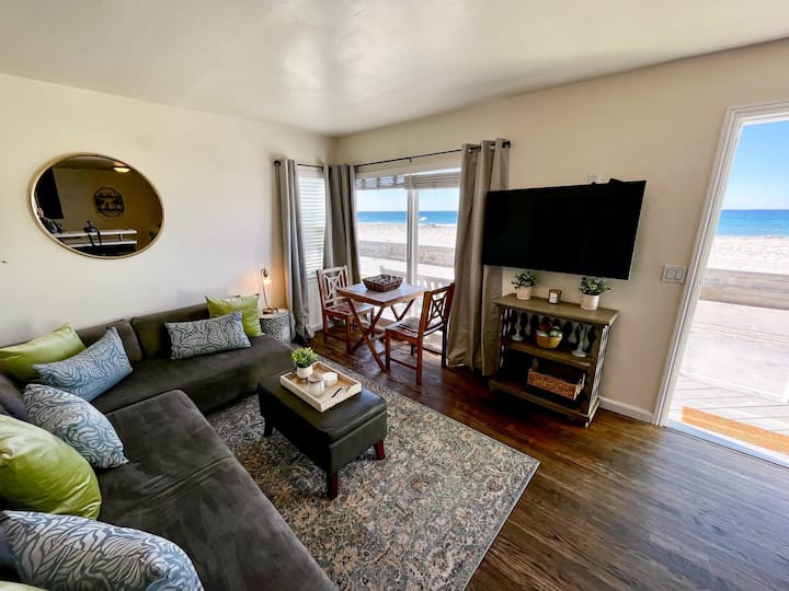 This oceanfront 2 bedroom, 1 bath beach house is perfect for your next Mission Beach vacation! Enjoy a signature San Diego sunset on the spacious deck overlooking the boardwalk, or go for a swim in the ocean, conveniently located 10 steps to the sand. You'll never want to leave!
