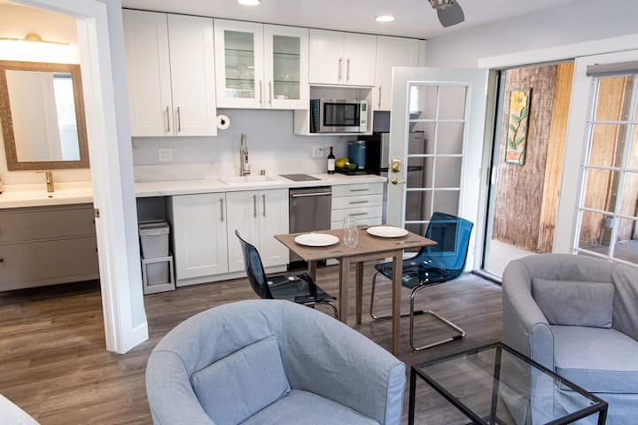 Furnished studio with a living space, full kitchen (with 2 induction burners and a convection/Air Fry/microwave oven), full bathroom, king bed and vinyl floors thro