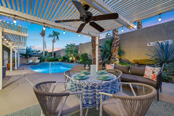 Desert Vibe is a 3 bedroom, 2.5 bathroom vacation home in beautiful Palm Desert, California. Private pool and spa, outdoor dining and lounging, and the yard is filled with lush plants, palm trees, pomegranite, citrus, and cactus. Spacious, open concept floorplan with fully equipped kitchen, great room, wet bar, and comfortable bedrooms. It's the perfect headquarters to enjoy all our beautiful desert has to offer - golf, tennis, hiking, biking, casinos, shopping and dining.