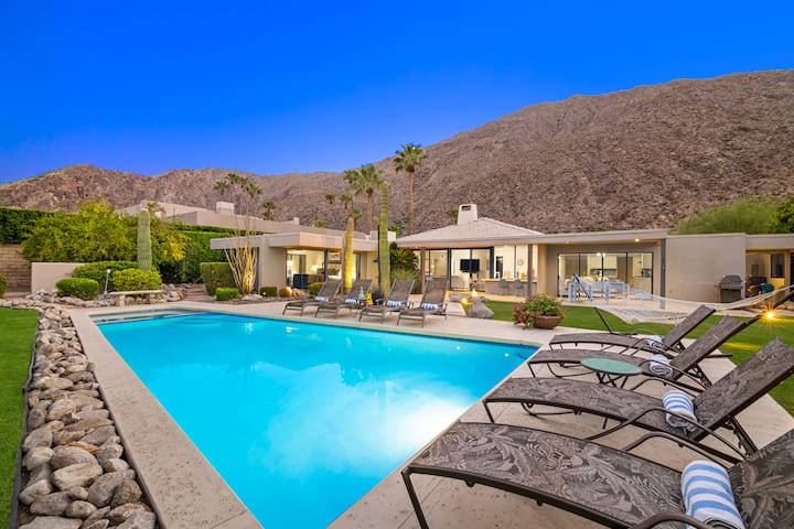 Located in one of Palm Springs' oldest, most historic neighborhoods, Martini Modern oozes quintessential Palm Springs charm. Airy high ceilings, walls of glass and gleaming floors will make you feel as if you've stepped right into the glamour of Old Hollywood. Featuring 4 bedrooms, 3.5 bathrooms and 3500 square feet. Perfectly situated on a third of an acre, the backyard is a poolside paradise. Custom angled pool and spa, gas firepit, indoor to outdoor wet bar, hammock, lounge chairs,