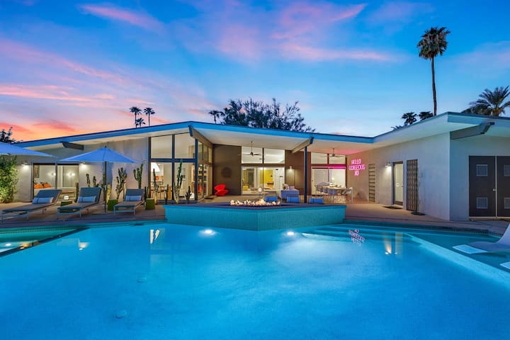 California Retro, circa 1963 is a beautifully remodeled, midcentury vacation home on half an acre in South Palm Desert. This 4 bedroom, 4 bath, 3,200 square foot home captures the essence of desert modernism - with its iconic roofline, clerestory windows, open concept floorplan, walls of glass and designer furnishings. The resort style yard has a private pool and spa, custom firepit, outdoor kitchen, living and dining areas and mountain views. When you venture out, you're a mile from world