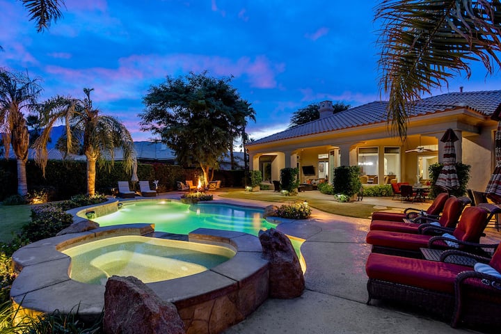 Tropicale at PGA is a gorgeous 5 bedroom, 4.5 bath villa overlooking the Weiskopf course. Outdoors features a saltwater pool, spa, tanning shelf, firepit, BBQ island, covered outdoor living and poolside lounge chairs. 4400 square foot floorplan with stunning chef's kitchen, spacious great room, gas fireplace, wet bar, pool table and 5 comfortable bedrooms. It's the perfect place to enjoy all the desert has to offer!