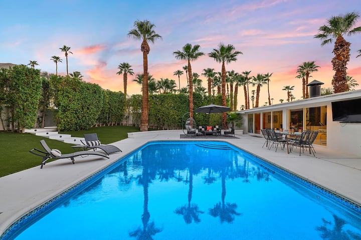 Welcome to the Atomic Lodge, a groovy 4 bedroom, with quintessential midcentury style. Indoors has an concept floorplan, mod fireplace, gourmet kitchen, and walls of glass that open up to the fabulous pool yard. The huge outdoor space is hedged for privacy, and has a heated pool, hot tub, plenty of outdoor living spaces and beautiful views of the mountains. The neighborhood is quiet and extremely walkable. When you venture out, you're in the heart of Rancho Mirage - it's the perfect d