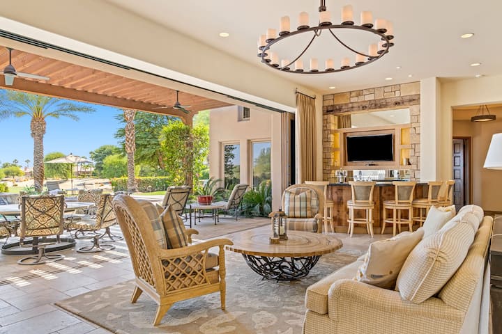Elegant and spacious, this 5000 square foot, all suite PGA West villa is situated on the 16th green of the Greg Norman course. Overlooking the lake and mountains, the disappearing walls of glass let in the spectacular views. Outdoors features a sparkling saltwater pool, integrated waterfall spa, firepit, BBQ island and plenty of poolside lounge chairs to catch the desert sun. It is the perfect headquarters to enjoy all our beautiful desert has to offer - golf, tennis, hiking, biking, casinos, s