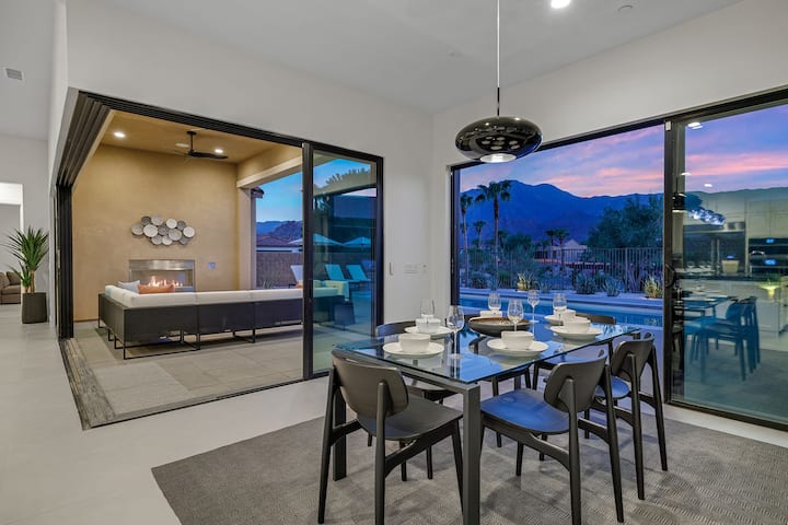 Coral Mountain is a modern, 4-suite vacation home in a peaceful area of La Quinta, with views of the Coral Mountain range. It offers all the amenities you want on vacation - pool, spa, outdoor fireplace lounge, open concept floorplan, gourmet kitchen and walls of glass looking out to the pool, palms and mountains beyond.
