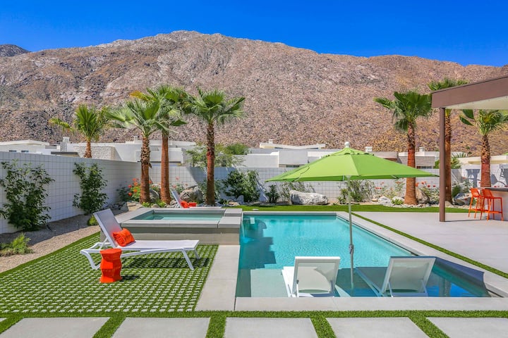 Inspired by mid-century modern architecture, Blue Skye Modern is a newly built home that is both walking distance to downtown Palm Springs and framed in the shadows of the San Jacinto Mountains. Spacious open concept floor plan with vaulted ceilings and moveable walls of glass. Everything is brand new - chef's kitchen, 4 suites with spa-like bathrooms and designer decor. The resort style yard has a private pool and spa, alfresco dining and gorgeous mountain views. If you choose to venture