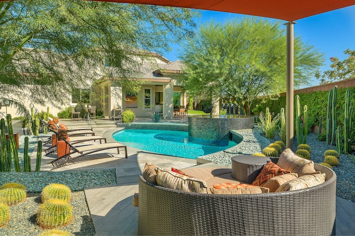 Empire Greens is a gorgeous, 4 bedroom and 5.5 bath former model home. Outdoors is walled and gated for privacy and has a private pool and custom infinity spa, fire pit, outdoor dining area and plenty of lounge chairs. Indoors has walls of glass for true indoor outdoor living, plus spacious interiors, gourmet kitchen, game room, and comfortable bedrooms. If you do decide to leave your peaceful retreat, it is the perfect headquarters to enjoy all our beautiful desert has to offer - golf, tennis,