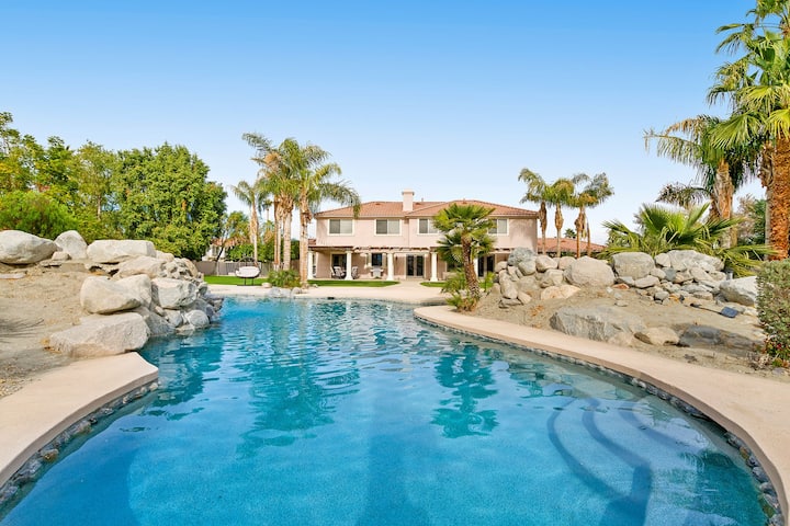 Laguna Cove is a 6 bedroom private estate situated on 1.25 acres. It has a massive, 84 foot resort-style pool with sparkling waterfalls, a 14 person jacuzzi, and park-like grounds. Over 5,200 square feet of living space with vaulted ceilings, gourmet kitchen, pool table, poker table, as well as 6 comfortable bedrooms. Located in a peaceful and private area of La Quinta, California, just minutes to Empire Polo Fields and Old Town La Quinta.