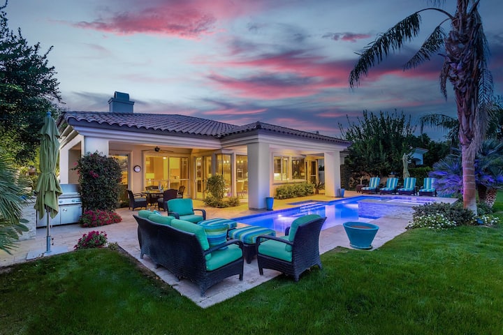 Villa Del Sol is a well appointed 3 suite vacation home overlooks the 4th fairway of the Nicklaus Tournament Course at PGA West. The outdoors has a lovely firepit lounge in the lush courtyard, and the backyard has a private pool, spa, outdoor dining, relaxation areas, gas BBQ, and plenty of poolside lounge chairs. The open concept interior has a gourmet kitchen, dining, living and billiards rooms, along with 3 comfortable bedroom suites. Walls of glass let in the beautiful pool and golf course