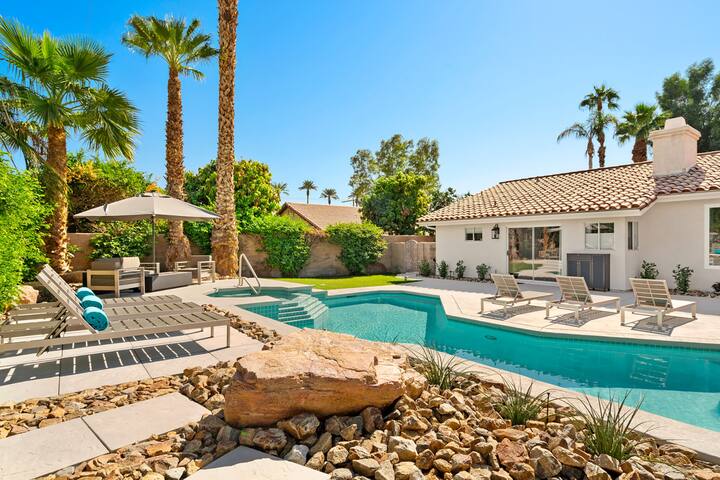 Walled and gated for peace and privacy, Sunbloom is a charming 5 bedroom/4 bath vacation home, walking distance to Old Town La Quinta. Sparkling pool, spa, outdoor shower, outdoor TV, 8 lounge chairs, outdoor dining and lawn games. The interior has been completely remodeled with a gorgeous new kitchen and bathrooms. Enjoy shuffleboard, ping pong and plenty of space to kick back and relax with your group. If you choose to leave your poolside lounge chair, it is the perfect headquarters to enjoy