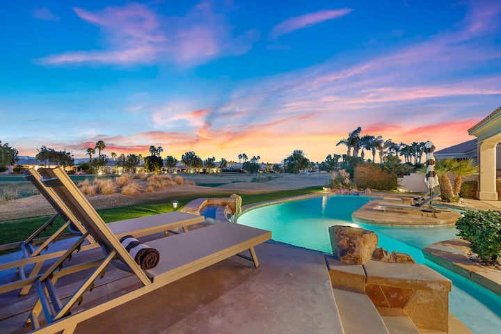 The Lagoon at PGA is a gorgeous home on the 15th fairway of the Nicklaus Tournament course. Striking the perfect balance of beauty and comfort, it features 5 bedrooms, 4.5 bathrooms, 4500 square feet and comfortably sleeps 14 guests. Open concept floor plan with bright views out to the pool and golf course. Luxury touches including travertine floors, a gas fireplace, pool table, fully equipped kitchen with slab granite and a wet bar with sink and mini fridge. The outdoors is perfectly space pl