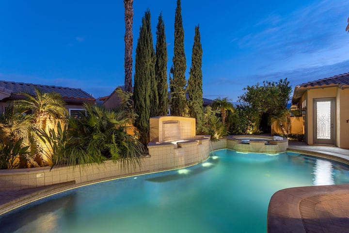 Villa Firenze is a 4 bedroom, 4.5 bath little slice of Tuscany in PGA West. The private center courtyard has a beautiful custom tiled pool and spa with water features, outdoor dining, lounge chairs and a built in BBQ island. The back patio has a firepit lounge and bubbling fountains. It overlooks the 14th fairway of the Nicklaus course and has gorgeous southern mountain views. The 3800 square foot interior is modern and beautifully furnished. Gourmet kitchen, spa like bathrooms, living room, di