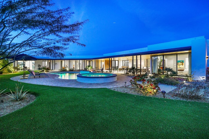 ** Call for Summer Specials! ** Sierra Vista is a privately gated, 1.25 acre, 7 bedroom paradise in Rancho Mirage. Perfectly space planned with resort amenities inside and out - just ready for you to relax and enjoy. The pool and integrated waterfall spa are surrounded by luxury lounge chairs, umbrellas and a fire feature. The fun continues with a pickleball court, basketball half court, bocce ball court, putting green and kids playground. Sleeps 18, with comfortable bedrooms, spacious living a