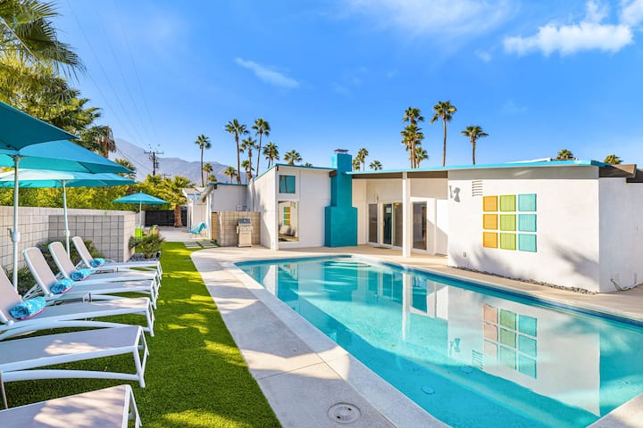 Exotic Tropics is a mid-century Alexander home, circa 1961, located in the Racquet Club Estates neighborhood. Beautifully remodeled, this 4 bedroom, 3 bath home retains its classic style, with the iconic roofline, clerestory windows, period-inspired art and original fireplace. Outdoors has all the amenities you want on vacation, heated pool, bocce ball court, firepit, and plenty of lounge chairs! Great location, walking distance to the Uptown Design District on Palm Canyon Drive.