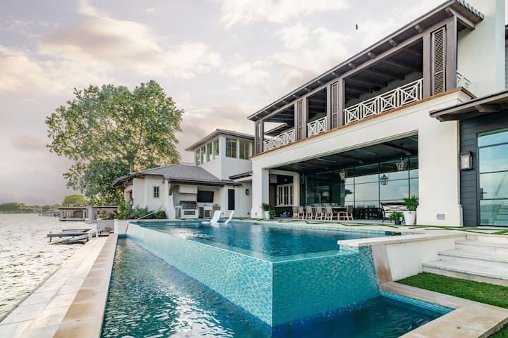 Above Vista del Faro is a stunning lakefront home that boasts gorgeous luxe finishes and decor, plenty of room for your friends and family, and all with the stunning views of the lake the famous Lighthouse just across the water.