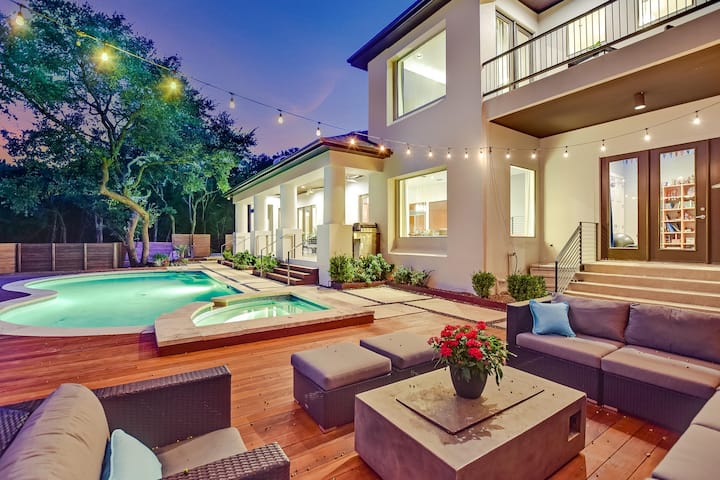 Secluded in the woods, this elegant estate is in the heart of Westlake and just 5 miles to the heart of downtown Austin. SKYLINE boasts 5 beautifully appointed bedrooms, incredible outdoor living space with pool and hot tub- plenty of room for up to 14!