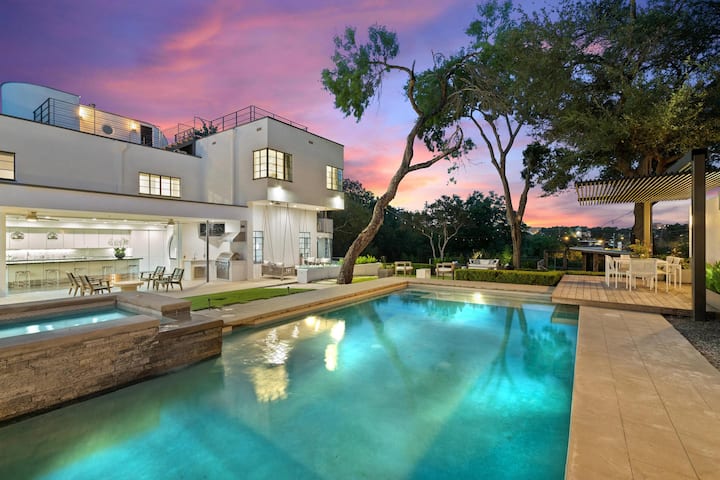The Bohn House was curiously inspired by the sci-fi flick, Lost Horizon, and the Queen Mary cruise ship. Sited on nearly half an acre, the Lone Star digs offer 6,528 square feet of living space, five bedrooms, four bathrooms and three half baths.