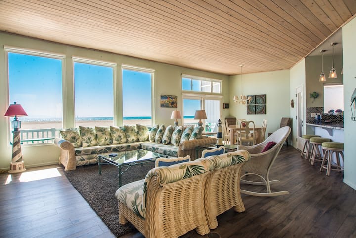 Walk into this oceanfront 2 story home in Hollywood Beach- first floor has master suite facing oceanfront with king bed sleeping 2ppl, flat TV 43” with DVD player, in cove in master bedroom bunk beds and trundle bed sleeping 4ppl,