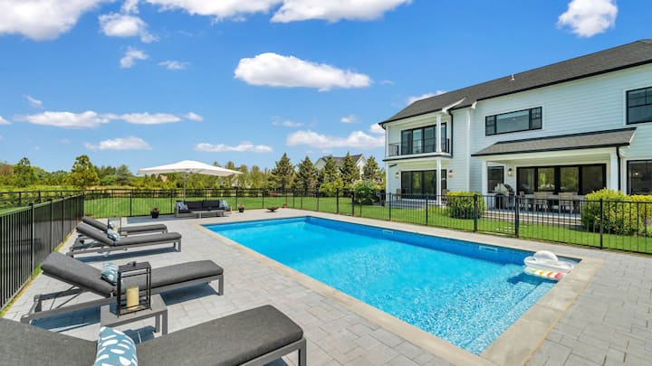 5BR/3.5BA - airy open floor plan, great room with gas fireplace, 18x36 saltwater pool, two Primary suites with outdoor access, Carrera marble bath, and upper-level family room