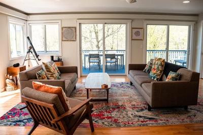 3BR/3BA – chic design, perfectly secluded, high end finishes, airy and light filled, gourmet kitchen, wood burning stove, walk-out family room