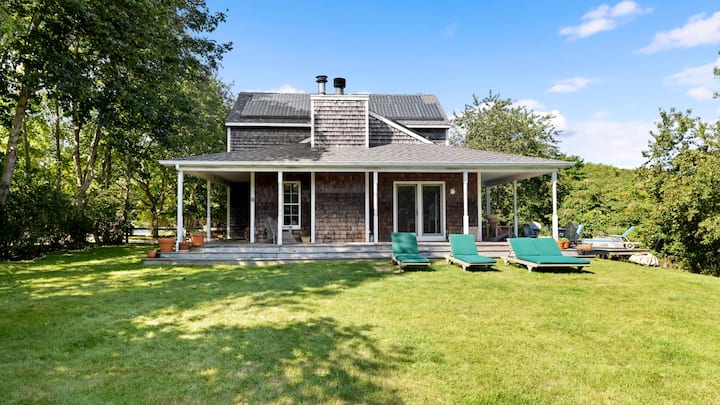 3BR/2BA—Ample privacy and space can be found at this charming farmhouse with expansive lawn space, wraparound porch, fire pit, updated furnishings, and fireplace.