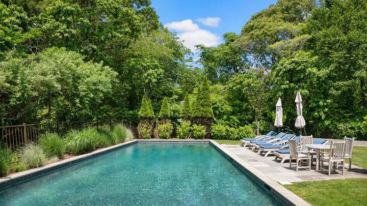 4BR/4.5BA—Light-filled and spacious home with a large, manicured yard and private heated pool, chef’s kitchen, master suite, finished basement, foosball and swing set