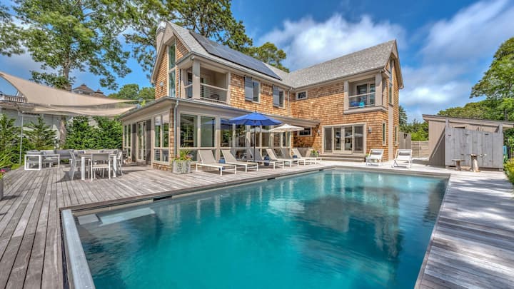 4BR/4BA w/ dock, pool, hot tub, outdoor shower, right in the heart of Quogue with views of the water