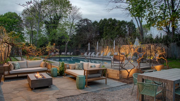 7BR/7BA - Southampton estate with oversized pool, ample outdoor lounge furniture, sublime furnishings, finishes, and appliances, Sonos speaker system, Cozy Earth linens, several outdoor fire pits, bicycles