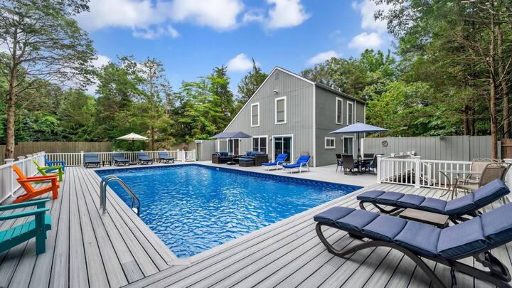4BR/2BA: Heated pool, open-plan kitchen, vaulted ceilings, spacious deck, open-plan common areas.