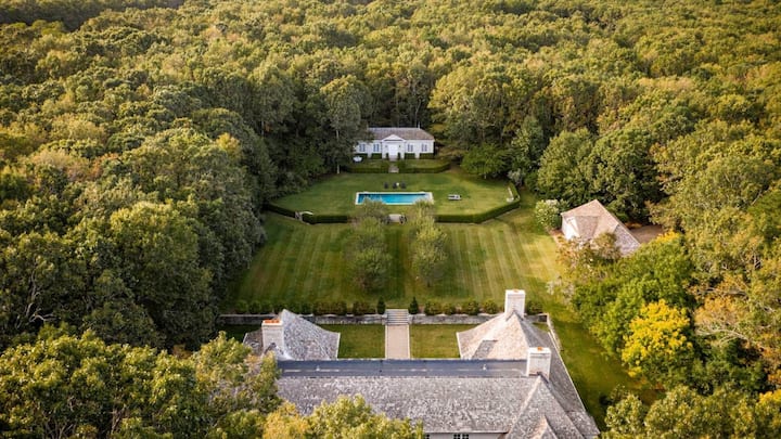 7BR/5.5BA—Light-filled main house with soaring ceilings and refined furnishings, private pool, guest house, five-car garage, expansive outdoor space, and more!