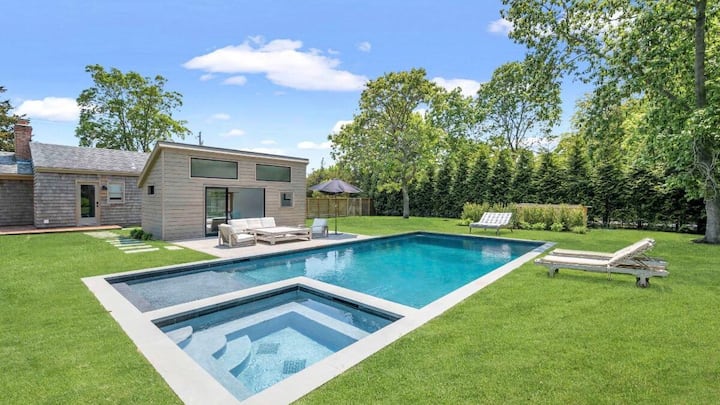 4BR/2.5BA with living room, open kitchen, gas grill, lounge chairs, gunite pool, pool house, hot tub, beach chairs, essentials
