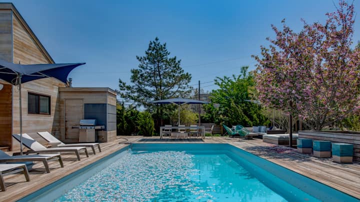 Coastal-style home with private pool, open-floor plan, ample natural light, located one block from the beach!