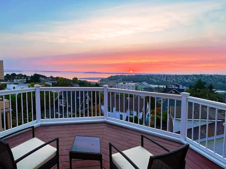Spacious home with spectacular views of Puget Sound, Elliott Bay, The Olympic Mountains, marina, & more! Watch a panoramic sunset from multiple decks on each floor! Adorable children's room next to the luxury master bedroom, great layout for multi-generational groups, families & group travelers! Located in the charming Queen Anne neighborhood, visit the best restaurants and shops Seattle has to offer! High-speed internet up to 1G, w/ WIFI-6 which has fast internet for games, streams & meetings!