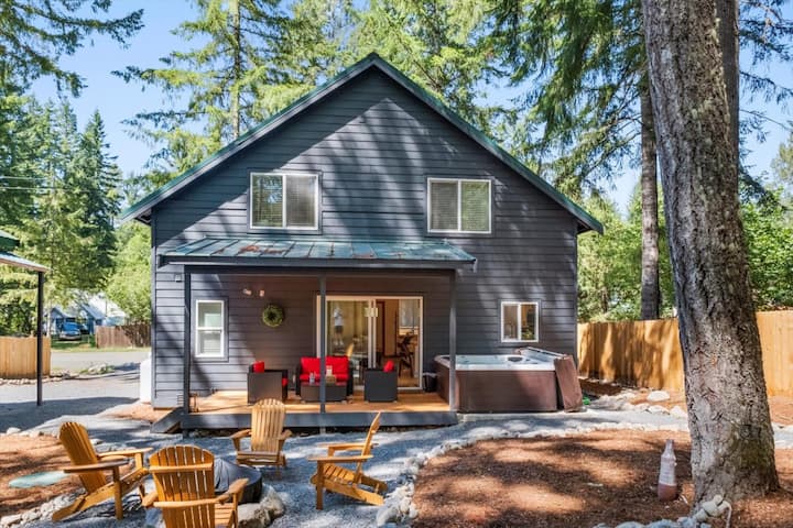 Experience the tranquility of our secluded cabin near Mt. Rainier! Rejuvenate in the tastefully designed outdoor covered fire pit area and indulge in the bubbling hot tub—a delightful conclusion to your day of outdoor escapades. Our community area boasts a lake, picnic spot, community building, and scenic walking trails. Don't miss the chance to book an unforgettable getaway!