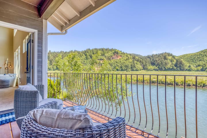 Bucolic Field and Foothill Views from this Pacific City Riverfront Home with Dock!