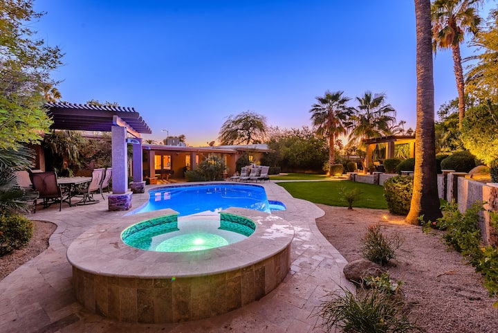 Make your Scottsdale getaway unforgettable with this luxurious, four-bedroom home, offering an incredible backyard area with a massive, furnished patio, private pool, outdoor dining, firepit, pool table, and more. Revel in tasteful opulence with this resort-style rental. Stay entertained with multiple flatscreens throughout, cable, and free WiFi. Feed your crew with meals from the full kitchen or the outdoor grill, and stay on top of the laundry with the private washer/dryer.
