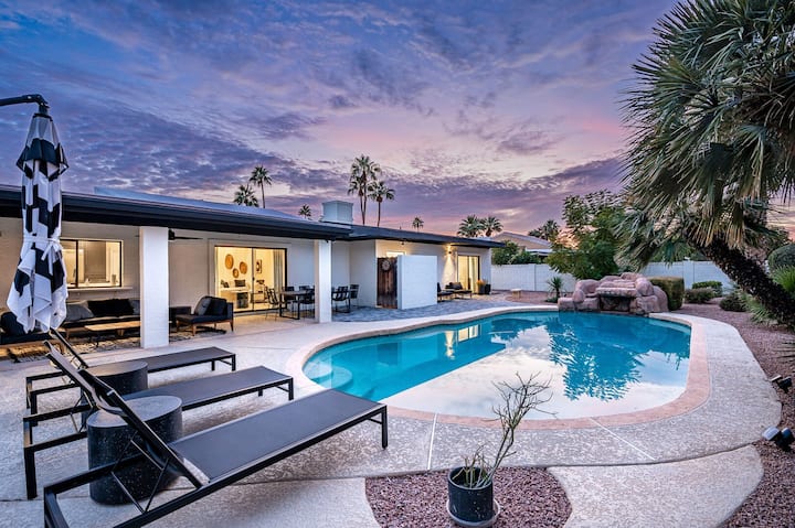 A 5 bedroom and 3 bath home, situated on a quiet cul-de-sac with an expansive backyard featuring a heated pool, fire pit, seating area, covered patio with dining, and additional lounge areas. The garage is converted into a game room featuring a pool table and foosball table. Minimum Age to Rent: 30 years old.