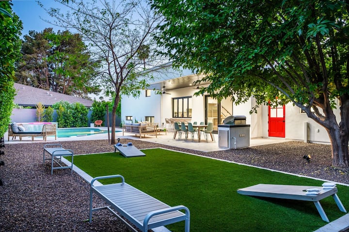 Welcome to Azura, a multi-level-split home with 5 bedrooms and 3.5 bathrooms located near Arcadia and Old Town Scottsdale. This spacious home features large open windows letting in plenty of natural light. Enjoy the convenience of a gourmet kitchen with all the modern conveniences, a grand living room with a fireplace, and plenty of room for entertaining. Each bedroom is spacious and cozy. Step outside and relax on the loungers, or take a dip in the pool to enjoy the Arizona sunshine.