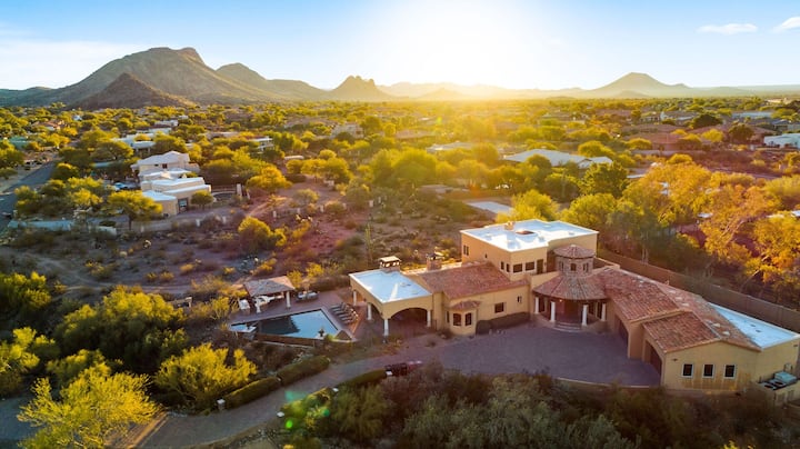 You will love staying at Turquoise Manor, with its 5 bedrooms 3.5 bathrooms in the main home, and a 1 bedroom 1 bathroom casita. Treat yourself to the amazing views from the infinity pool or outdoor shower, or while cooking at the bbq and dining outside. Play at the pool table or relax outside in one of the many living room areas. Coming inside there is a movie theater, wet bar area, wine cellar room, and several areas where you can play games together.