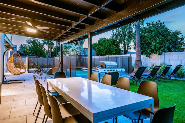 This single-level home is an iconic example of modern living. The home is an oasis of tranquility. As you enter, you are greeted with a sleek design complemented by a stunning open-plan layout. The living area is filled with natural light and offers a desk area for working on the go. Enjoy a gourmet kitchen with high-end appliances and stocked cookware. Step outside to find a family-friendly swimming pool and spa enclosed in the backyard. Everything you need for a modern vacation is here!
