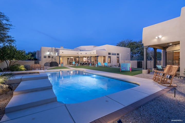 Midnight at the Oasis is the ultimate desert vacation getaway, with over 4,000 sq. ft. of living space, all the amazing features, and amenities available on one acre of land. When you head outside you will find so many great areas to dine, lounge, and have fun. There is an outdoor Connect 4 game, a tether ball, and a sparkling pool with a jacuzzi. Inside you will find many board games, a dart board, a 2-player sit-down arcade system, and a Golden T-Golf arcade system.