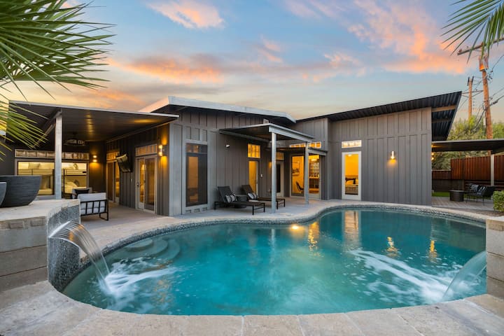 Vacationing at The Modern means you are looking for a classy home with all 3 covered patios, a gourmet kitchen, a separate wet bar, a sparkling pool, and waterfalls! You will be staying in a private oasis. The modern designs mixed with technology and natural wood accents make for a beautiful setup for comfort. Outside is a private resort ready for you to gather around the outside living furniture with private patio spaces and soak up the sun on the pool loungers.