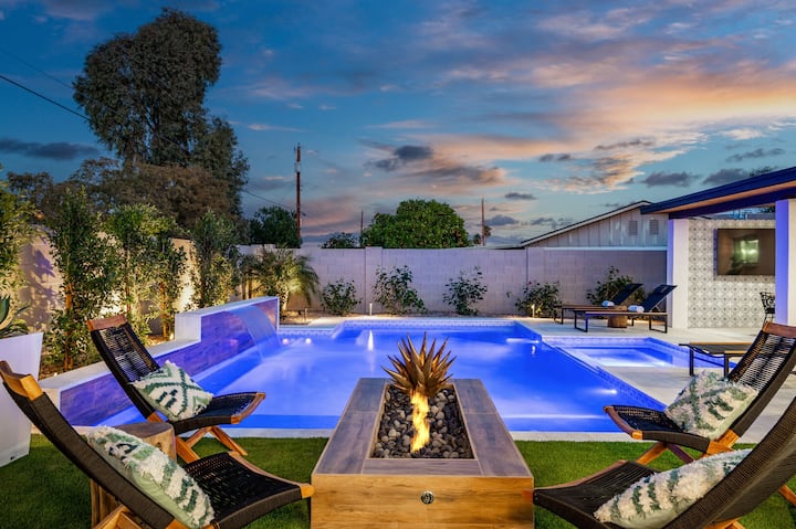 Unwind in its highly designed, intimate backyard, complete with a heated pool, oversized spa, BBQ, dining area, gas fire pit, outdoor TV, and covered lounge area. If you came to enjoy Arizona’s beautiful weather, this backyard is the place to do it! Designed to easily accommodate families or groups of up to 12, Desert Lotus is accessible to the Phoenix Zoo, the Botanical Gardens, Papago Park, Old Town Scottsdale, and many other dining and entertainment venues.