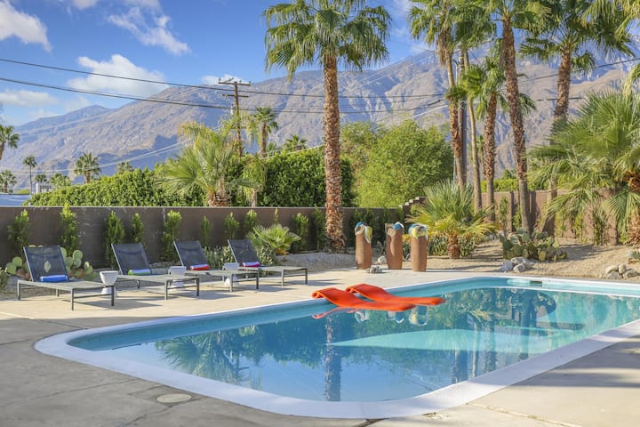 Amazing large backyard with exceptional mountain views. This modernist Alexander vacation home is conveniently located within minutes to all the activities and attractions of Palm Springs.