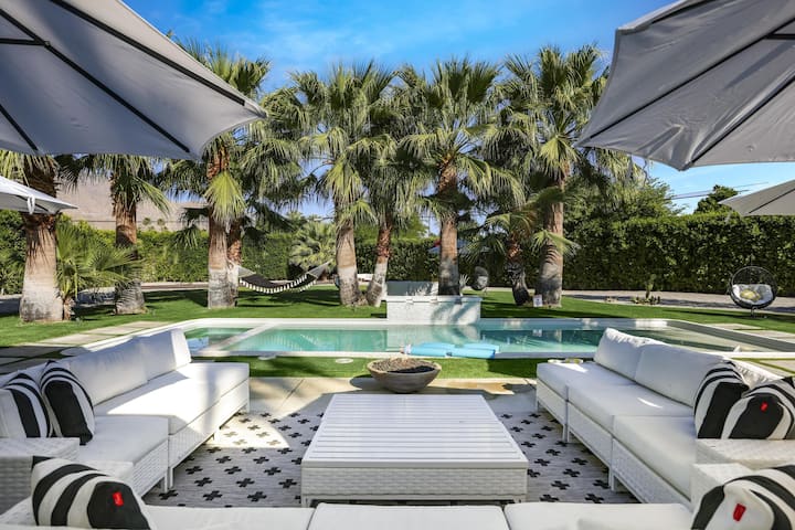 Thoroughly modern 4 bed, 3 bath California Ranch! Expansive green lawns for a game of croquet, an incredible pool with tanning deck and spa surrounded by palms, a bocce ball court, three seating areas with fire pits, and a shipping container pool cabana!