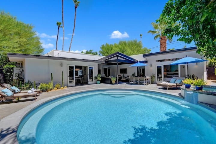 Beautiful, relaxing home in South Palm Springs. Pool cabana, pool\spa, outdoor living room with fireplace, and amazing views of the mountains. Quiet street, close to town!