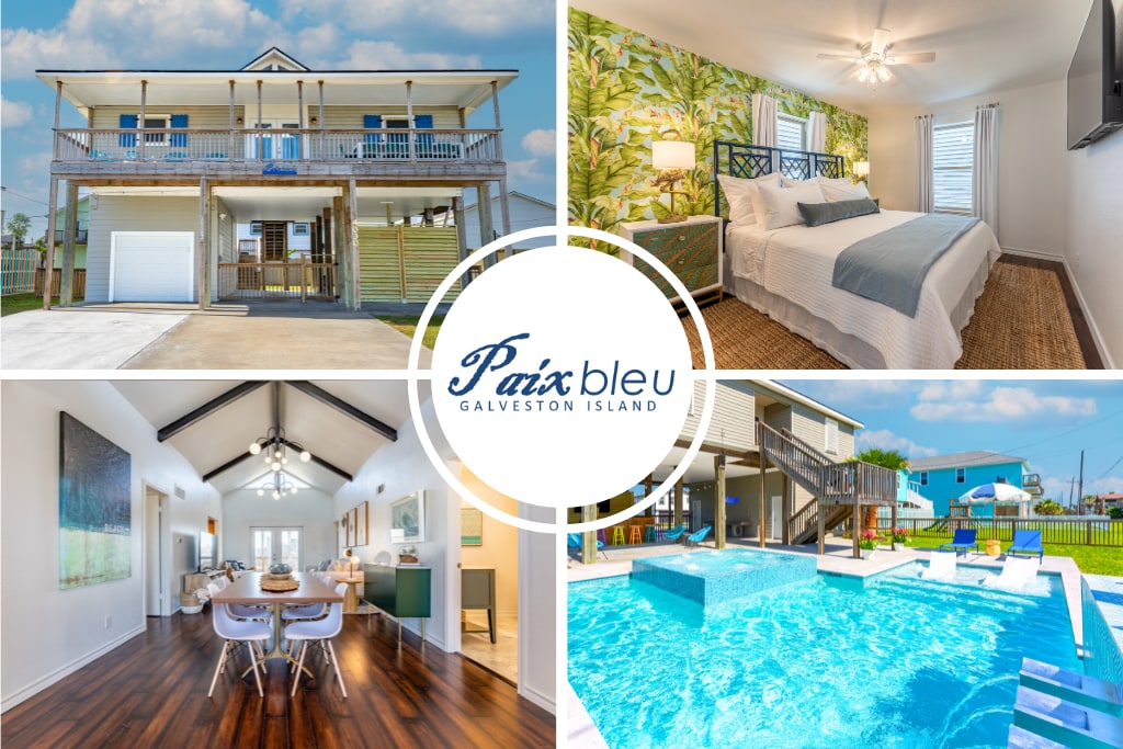 Welcome to Paix Bleu -- our take on casual, coastal chic! This freshly revamped 1968 beach bungalow is a 4BR/2BA home in the Sea Isle neighborhood. Paix Bleu sleeps 12 and features a private pool and spa, stylish interiors, and plenty of space to gather indoors and out. Enjoy plush beds, a spa-like primary suite, and a kitchen designed for entertaining. Dine on the 40-ft balcony, unwind by the outside bar, and make lasting memor[ies]. The description also highlights an airy living room with a sectional, 65” Smart TV, and dining for eight, plus a second breakfast table for four. The kitchen has granite counters, stainless appliances, and a coffee bar. Bedrooms include a primary suite with a king-sized Purple mattress and a spa-like ensuite, a "Jungle Room" with a king-sized Nest Bedding mattress, a "Teal Room" with a queen-sized Purple mattress, and a "Bunk Room" with a twin-over-full, twin-over-twin, and twin trundle. Both bathrooms have rainfall showerheads and Beekman 1802® bath amenities. The backyard features a private pool and spa (heatable for an additional fee), a bar, an outdoor TV, lounge chairs, a shuffleboard table, and yard games. The yard is fully fenced and pet-friendly.