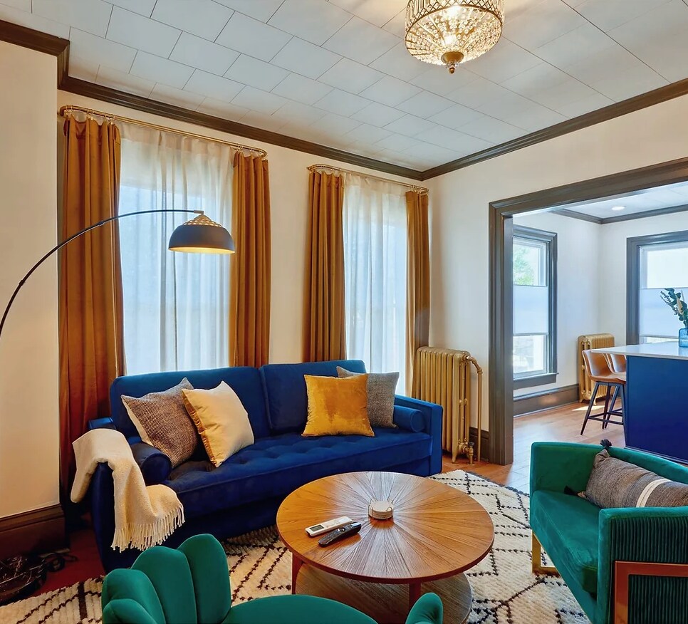 This stylish and modern place is ideal for families, traveling workers, and anyone seeking relaxation in Burlington. The updated historic home, built around 1865, showcases attention to detail and design. The apartment offers amenities comparable to a luxury hotel, including fine linens, plush bath sheets, and handcrafted toiletries. The kitchen is fully equipped with all necessary items. It's a 5-minute drive to historic downtown and an 8-minute drive to the hospital. The space combines old-world craftsmanship with modern comforts, featuring a large velvet sofa and plush velvet chairs in the living room, along with a 65" LG OLED TV. Large windows with velvet and semi-sheer linen curtains provide control over sunlight. A laundry closet in the living room includes a full-sized washer and dryer. The luxurious bathroom has an emerald tiled shower with Kohler fixtures and handcrafted spa-quality soaps, plus a double vanity. The fully stocked kitchen includes coffee, assorted teas, sugar, creamers, olive oil, vinegar, salt, pepper, pots, pans, baking sheets, mixing bowls, wine glasses, utensils, a toaster, a coffee maker, measuring cups & spoons, and knives. The first bedroom has a king-sized bed with luxurious hotel-quality linens from Parachute, nightstands with touch-activated lamps, an antique dresser, and a wardrobe. The second bedroom features a queen-sized bed with similar linens, nightstands, and golden lamps, along with an antique dresser and closet. Both bedrooms have room-darkening velvet curtains for a tranquil night's sleep. Guests have access to the whole apartment.