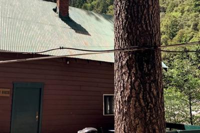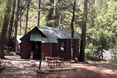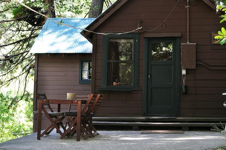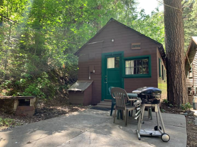 This charming cabin near the suspension bridge has a private backyard area with stunning mountain views. Enjoy a meal on the patio at the four-person table. The cabin has two bedrooms, each with a full-size bed, and a bathroom with a stand-up shower. The kitchen is fully equipped with a fridge, stove, microwave, coffee pot, and basic dishware, pots, pans, and utensils. A small propane barbecue is also available.